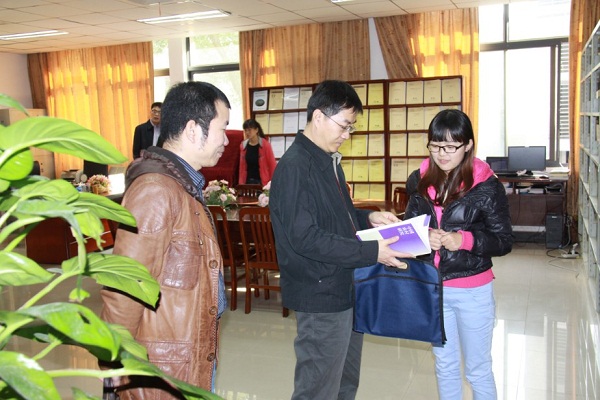贺更行处长一行首先参观了院资料中心,仔细翻看了我院学术著作、政策咨询报告和农村调查问卷等,了解我院研究成果,并着重就调研员的培养问题进行了询问。在展示中心,贺处长与郝处长观看了中国农村研究院宣传资料片,听取了我院研究人员对“百村观察”项目和院属各大研究平台的情况介绍。接着,客人来到村庄原始档案室,对我院保存完整的村史资料表示赞赏。