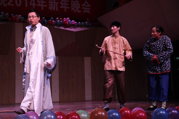 晚会在一组激情、欢快的现代舞蹈中拉开大幕,基地班杨瑞伦、黄璐瑶、孔浩、唐丹丹四位同学担纲主持人。黄振华老师一曲《冬天里的一把火》迅即将现场观众的热情点燃,他手舞足蹈、高声献唱,同学们欢呼喝彩,令这个冬至的夜晚不再寒冷。接着,同学们自主编排的小品《暑期调研之西游行》将大家参加“百村观察”调研的场景搬上舞台。“师傅”带着“徒弟”一路与省厅领导、乡村干部和农户打交道,这之中有刻意刁难,有冷漠不理解,也有真情流露,反映了基地班同学通过实证调研得来的成熟理性和丰富智慧。而另一个小品《毕业之后》则将同学们带向了未来,通过“相亲节目”的形式,展现了同学们凭借在基地锤炼出的扎实的调研功夫和写作能力,纵横“职场”与“情场”,收获成功的喜悦。