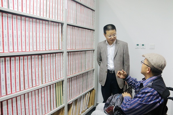 王旭东首先来到学院资料中心,在听取了我院研究人员关于咨政报告、县志收藏以及“百村观察”原始问卷的介绍后,他对学院资料规模、归类的科学性以及微观视角的研究方式予以了充分肯定,并对我院“扎根调研”的实证研究理念予以了高度赞赏。