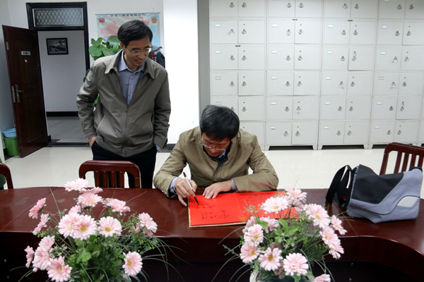 李勇华一行仔细翻阅了陈列于我院资料室的学术著作、浏览了资政报告墙,对我院形成的“一周一报,一月一报”的咨询报告呈送机制表示肯定,并对我院能够充分锻炼学生综合能力的几大平台表示赞赏。翻看过资料室中整齐排列的县志以及编辑成册的“百村十年观察”农户问卷后,李教授随即为我院题字“学高为师,身正为范”,称我院在农村研究中起到了模范作用,堪称榜样。
