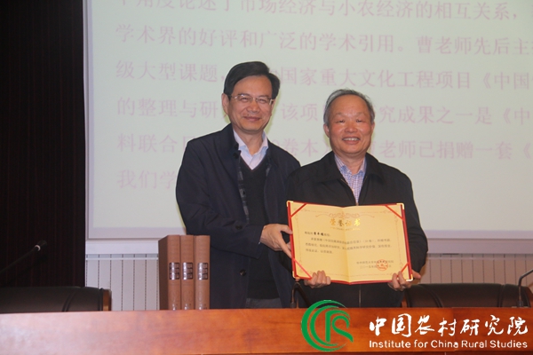 邓大才教授首先对曹幸穗教授的学术背景及研究成果进行了简单介绍,并对其莅临授课表示热烈欢迎。紧接着,徐勇教授为曹教授颁发捐赠证书,以感谢曹教授惠赠中农院《中国馆藏满铁资料联合目录》(30卷)。
