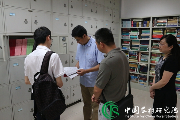 张思教授首先在讲解员的引导下来到资料室,浏览了我院自创刊一直延续至今的《中国农村研究》,他详细询问了出版情况及目前所取得的学术成就。在仔细翻阅我院的地方改革和村民自治书系后,张思教授称赞我院的研究为“最成功的典范”,认为基础性研究很重要,而且能持之以恒的做下去,非常的不容易,全国所有的近代史所可能都不及我院。当看到根据我院硕博士研究人员的照片作品编辑出版的《消逝的村庄》、《最后的农民》,张思教授评价到,此书每张照片都有名称及拍摄的时间地点,规范完整,通过此种形式将消逝的村庄文化得以保留非常不容易。接着,张思教授参观了我院保存完整的县志与村志以及“百村十年”项目的纸质问卷,他结合其在日本的调研经历,希望在问卷设计,问卷调查方面与我院合作,推动我院的海外农村研究。