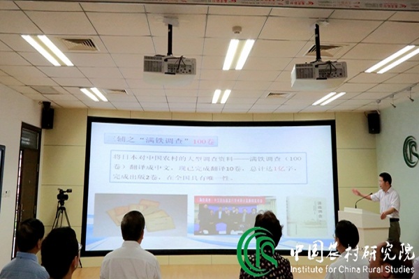 在展示中心,邓大才教授首先向调研组一行介绍了中国农村研究院的基本情况,并以“大调查、大数据、大服务”为关键词向来宾重点讲解了基地的学术研究与智库建设。一是“大调查”,即由中国农村调查为主体,“满铁”农村调查、俄国农村调查、海外农村调查为辅助构成的“一主三辅”世纪农村调查工程。二是“大数据”,我们经过多年积淀,打造了中国农村社会调查系统、中国农村社会动态跟踪系统、中国农村村情观测系统、中国农村数据库、农村政策仿真预测系统,由此形成合力,构成了中国农村发展智库平台;其中,调查数据、方志与村庄档案以及电子化资料均名列前茅;同时,对数据进行挖掘利用,撰写了“中农报告”“中农简报”、“中农动态”系列报告,并形成了成熟的呈递周期,咨政成果丰硕,比如中国农村动态跟踪系统,通过抓取网络信息撰写的“中农动态”引起了国家相关部委的高度关注,发函要求我们每期呈送。三是“大服务”,即针对中央、地方与社会各有特色的全方位涉农决策服务,2009年到2015年,我们撰写的咨政报告被批示176份,其被中央和国家机关批示142份;地方试验与改革项目成果显著,社会反响强烈,为中央决策提供了及时有效的支持。