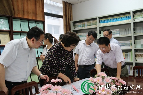 在学院资料中心,调研组仔细翻阅了陈列整齐的学术著作、咨政报告与县志收藏,认真听取了邓大才教授对学术成果、咨政报告的介绍,对各项研究成果和资料整理予以了高度肯定。