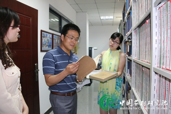 参观过程中,李里峰教授首先在讲解员的引导下来到资料室,他仔细翻阅了中国农村研究书系和陈列的咨政报告,他表示,自己办公室存放着许多中农院的书籍,并对中国农村研究院丰厚的学术底蕴表示赞赏。在看到2015年刚出版的“满铁”调查第一辑时,李教授由衷的感叹这个项目意义重大。进入智库展示中心,讲解员向李教授介绍了中国农村发展智库平台,并以具体村庄为例演示了村情观测系统,还就调查系统中原始问卷中涉及上访部分作了专门阐述。随后,李教授来到村庄档案室,浏览了部分保留完整的村庄档案,并对村庄档案的保存问题提出了将其电子化整理的建议。