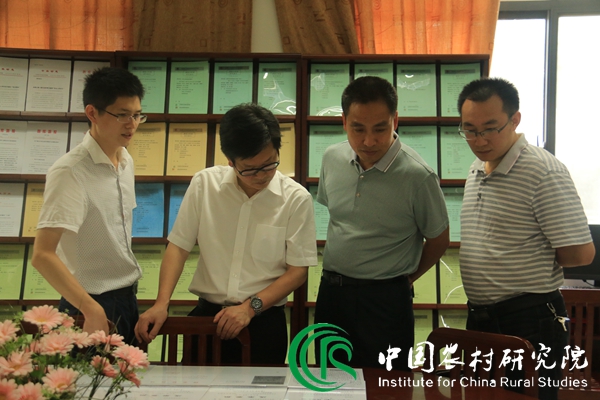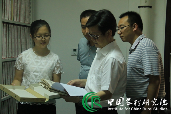在基地研究人员陪同下,陈主任一行首先来到了学院资料室,他对展列整齐的系列学术著作十分关注,先后翻阅了《湖村经济》、《中国农村村民自治》等多本著作,称赞中农院实证研究扎实专注,研究成果走在学界前沿。面对陈列眼前的咨政报告等一系列“中农成果”,陈主任久久驻足,仔细查看,不时点头称赞。随后,陈主任一行在展示中心听取了智库系统的专门讲解,并参观了村庄档案室。