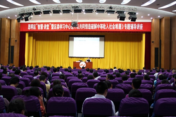 徐勇教授一行先后考察了思明区镇海社区、振兴社区和莲花五村社区。通过实地走访、听取介绍、举行座谈等形式,徐勇教授等深入了解思明区开展“美丽厦门·共同缔造”试点工作情况。下午,徐勇教授、邓大才教授应邀为思明区“智慧讲堂”暨区委中心组专题学习会议作辅导报告。思明区委副书记郑一琳主持报告会,全区副科级以上领导干部、各社区居委会书记参加学习。