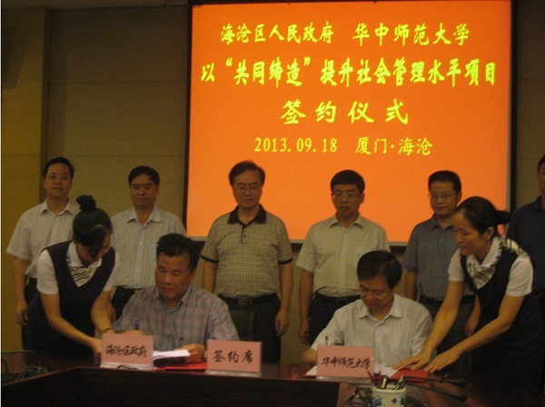 2013年9月18日,徐勇教授、邓大才教授率领课题组在厦门市海沧区调研。期间,徐勇教授、邓大才教授分别为区委中心组集中(扩大)学习会议作专题辅导报告,并与海沧区政府签订了合作协议。